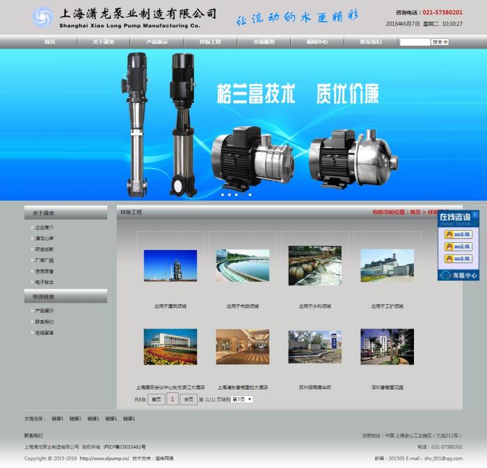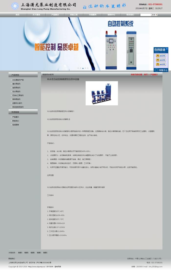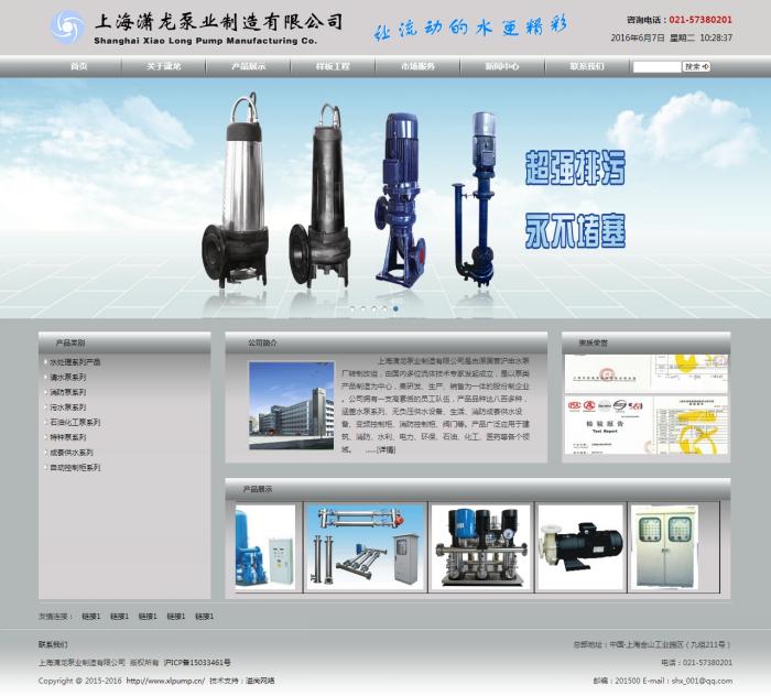 上海瀟龍泵業制造有限公司是由原國營滬申水泵廠轉制改組,由國內多位流體技術專家發起成立,是以泵類產品制造為中心,集研發、生產、銷售為一體的股份制企業 。公司擁有一支高素質的員工隊伍,產品品種達八百多種,涵蓋水泵系列、無負壓供水設備、生活、消防成套供水設備、變頻控制柜、消防控制柜、閥門等。產品廣泛應用于建筑、消防、水利、電力、環保、石油、化工、醫藥等各個領域。
