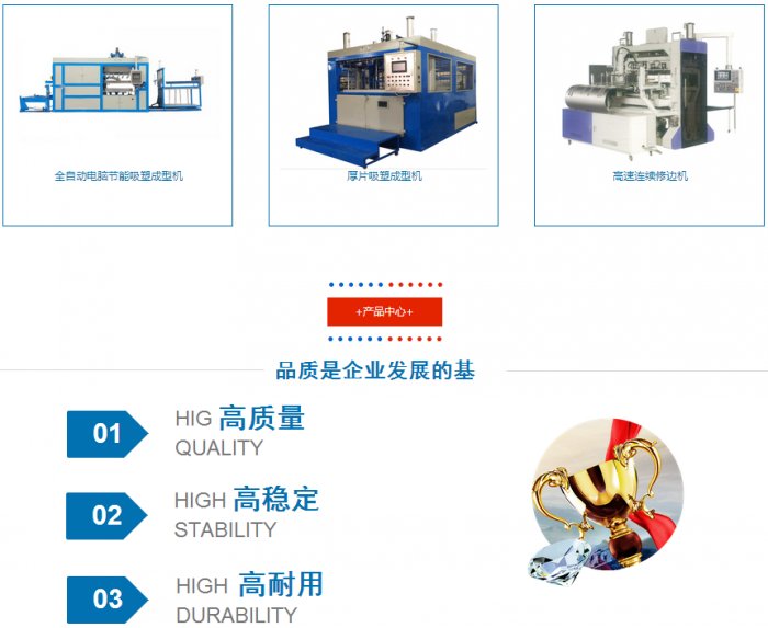 香廣機械,致力于成為中國最專業的塑料熱成型設備供應商。2005年在上海創立至今,一貫遵從“誠信、務實、開拓、創新”這一經營理念,以高品質的追求,贏得顧客與市場的青睞。主要產品包括:全自動正負壓成型機生產線、全自動負壓裁切一體生產線、全自動吸塑成型機系列、厚片吸塑成型機系列、材料擠出生產線系列、一次性制杯設備生產線、高周波塑膠熔接機系列、超聲波塑膠熔接機系列、精密四柱油壓裁斷機系列等。