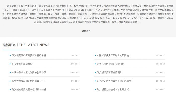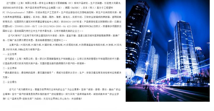 迂弋塑膠(上海)有限公司是一家專業(yè)從事高分子聚碳酸酯(PC)板材產(chǎn)品研發(fā)、生產(chǎn)及銷售,引進(jìn)意大利最先進(jìn)的UNION共擠設(shè)備,其產(chǎn)品采用世界領(lǐng)先企業(yè)美國(guó)(GE)、德國(guó)(BAYER)、日本(帝人)高分子工程塑料PC(Polycarbonate)為原料,引進(jìn)臺(tái)灣生產(chǎn)工藝技術(shù)。生產(chǎn)線全部自動(dòng)化及微電腦控制,所生產(chǎn)出來(lái)的陽(yáng)光板、耐力板具有透明度高、重量輕、抗沖擊、隔音、隔熱、難燃、耐老化、抗紫外線,又稱安全玻璃或防彈玻璃,透明鋼美稱等優(yōu)點(diǎn),經(jīng)國(guó)家防火建筑材料質(zhì)量監(jiān)督檢驗(yàn)中心測(cè)試,按GB8624-1997標(biāo)準(zhǔn),產(chǎn)品燃燒性能達(dá)到難燃B1級(jí)。已通過(guò)歐盟RoHS、ISO9001:2008、GB/T 116-2012/8624-2006、GA 422-2008、建筑材料CNAS及防火、防爆等多項(xiàng)國(guó)家及國(guó)際認(rèn)證。是目前國(guó)內(nèi)同行業(yè)中生產(chǎn)技術(shù)最先進(jìn)、公司環(huán)境最優(yōu)美的企業(yè)之一。