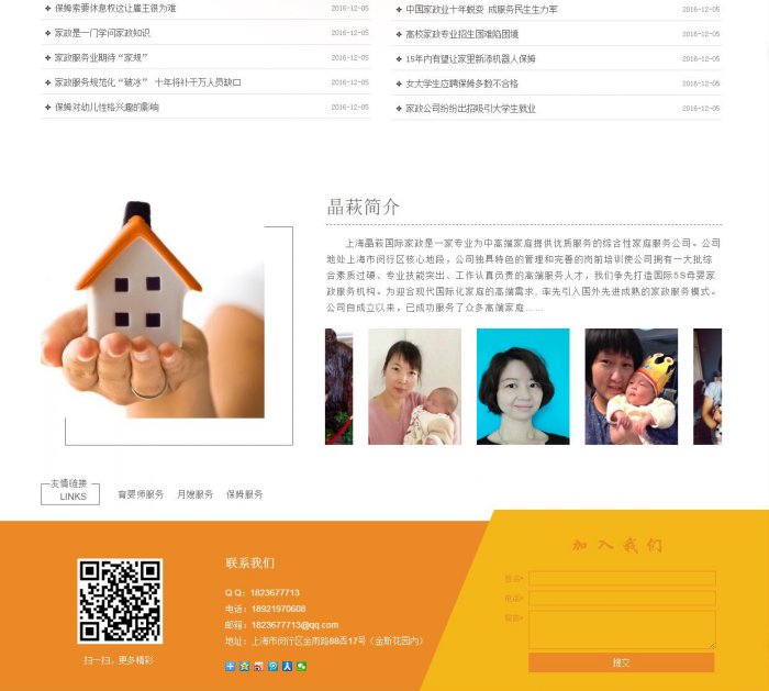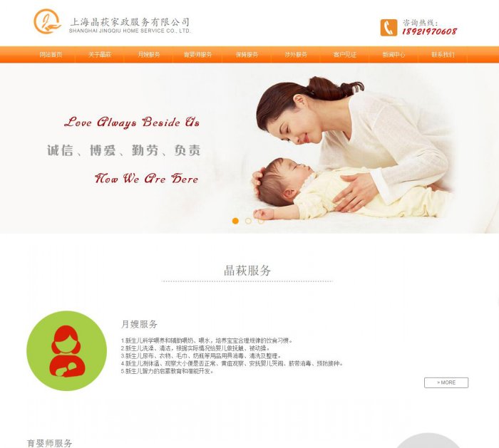 上海晶萩國際家政是一家專業(yè)為中高端家庭提供優(yōu)質(zhì)服務(wù)的綜合性家庭服務(wù)公司。公司地處上海市閔行區(qū)核心地段,公司獨(dú)具特色的管理和完善的崗前培訓(xùn)使公司擁有一大批綜合素質(zhì)過硬、專業(yè)技能突出、工作認(rèn)真負(fù)責(zé)的高端服務(wù)人才,我們爭先打造國際5S母嬰家政服務(wù)機(jī)構(gòu)。為迎合現(xiàn)代國際化家庭的高端需求, 率先引入國外先進(jìn)成熟的家政服務(wù)模式。公司自成立以來,已成功服務(wù)了眾多高端家庭. 我們的客戶主要面對商家、政界、中產(chǎn)階層、500強(qiáng)企業(yè)、駐中機(jī)構(gòu)代表等外籍人士獲得各界人士的好評。