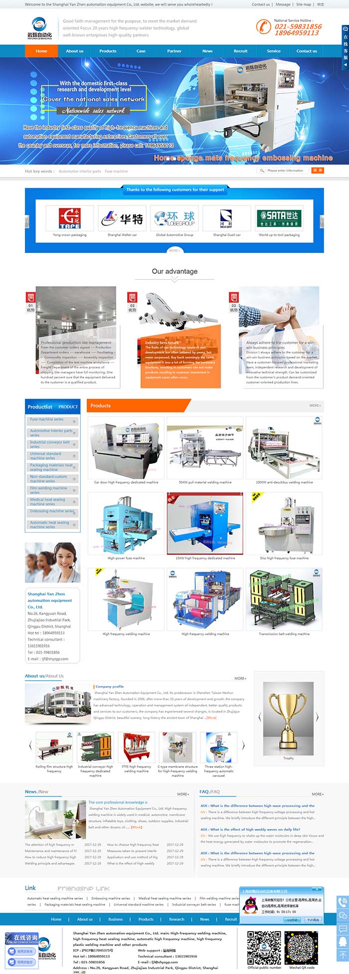 上海巖甄自動化設備有限公司其前身是深圳臺資賀順機械廠,公司成立于2006年,歷經十多年的成長與發展,公司有先進的技術、具有公司內部的營運與管理體系,精益求精的產品服務于廣大客戶,公司歷經幾次變遷,現位于風景秀麗、歷史悠久的上海市青浦區朱家角古鎮。目前公司具有4000余面積的廠房,現有員工50多人,工程師4人,各類技工15人。本公司是國內高頻機及自動化設備研制廠家,集研發,制造、服務的生產企業。擁有雄厚的技術力量、先進的加工設備,多名工程師與員工團隊。獨特的管理體制、完善的服務體系,公司嚴格執行ISO9001質量標準與國際CE認證標準。