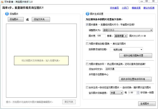 5.批量處理軟件頁面右邊是為左側列表中的圖片設置,分別有圖片瘦身、美化圖片、增加水印、合并圖片四個功能。*特別提示:處理水印圖片最好是另存為,這樣有所改動的圖片可重新處理。