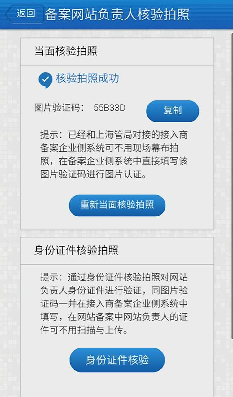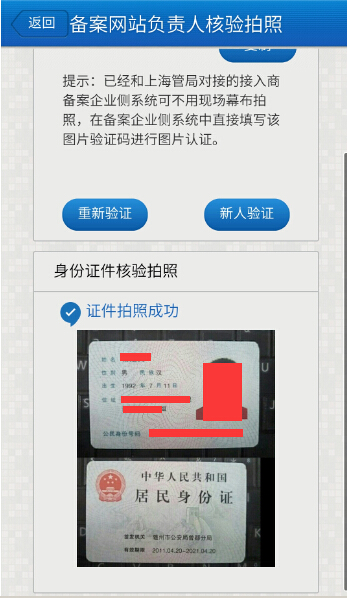 重新驗證:如果您的核驗拍照環(huán)境光線不清楚時,可以選擇重新驗證。點擊會重新進入備案網(wǎng)站手機當(dāng)面核驗拍照,驗證成功將替換上次手機核驗拍照圖片。