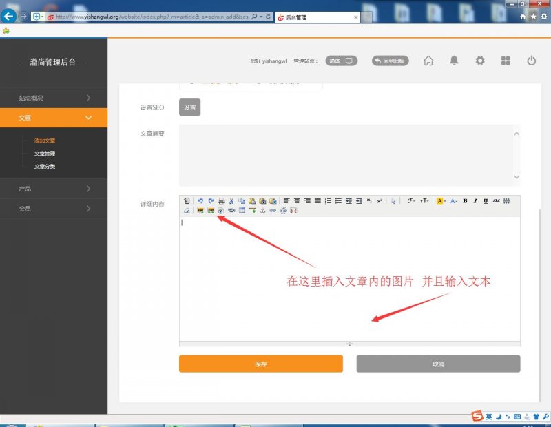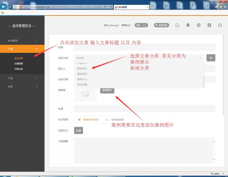 3.選擇您需要添加、修改、刪除的內容 區域(產品、文章), 在網站后臺初始界面點擊“文章”,然后選擇“添加文章”即可進入新聞添加界面(如下圖)