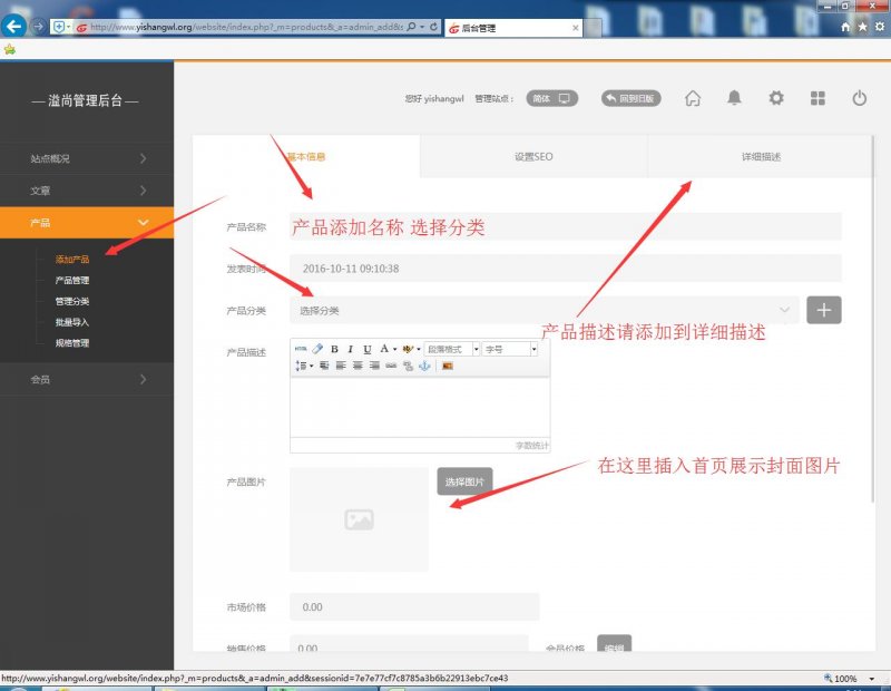 6. 添加產品:點擊添加產品,輸入產品名稱,選擇產品分類,點擊產品圖片,插入首頁展示封面圖片,最后輸入產品內容即可。