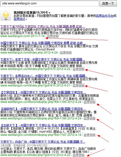 對于百度快照,也有人單純的用SITE指令看下對方頂級域名或者WWW域名的快照更新日期(有人能承受三天之內,有人能承受7天之內),筆者不反對這個參考指標,但是作為我們更好關注除掉首頁的快照之外的內頁快照,如下圖: